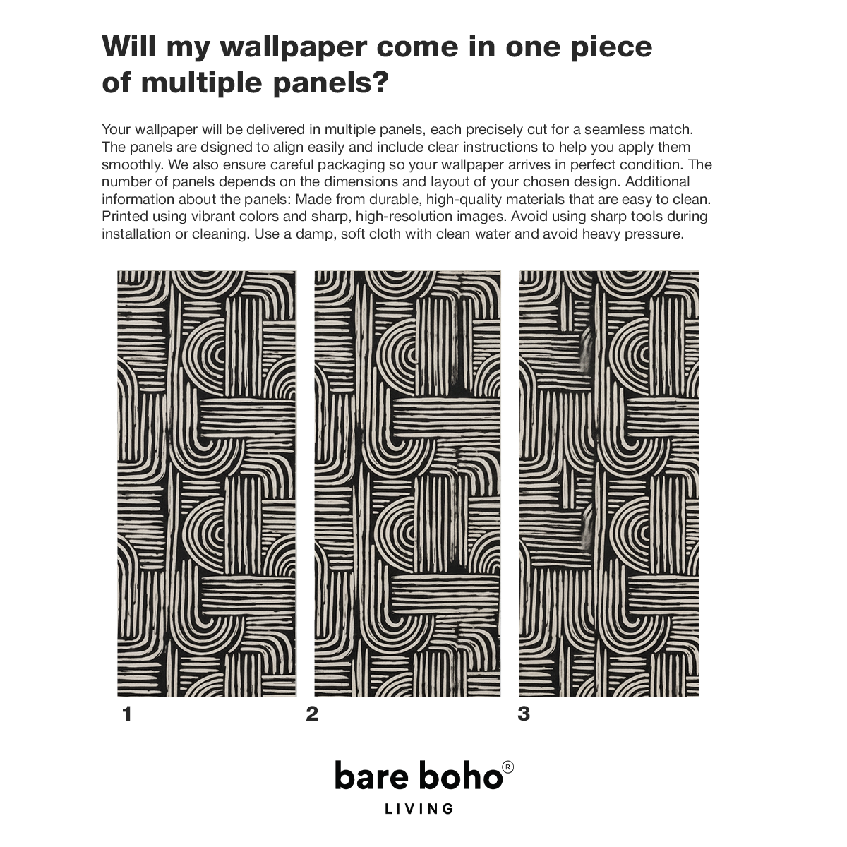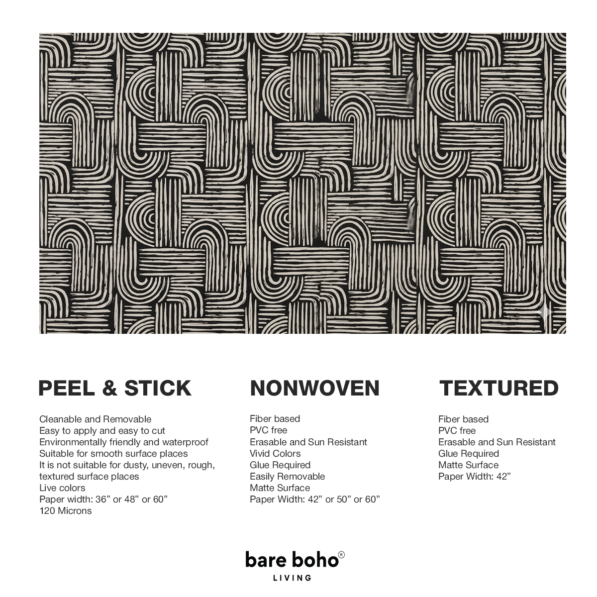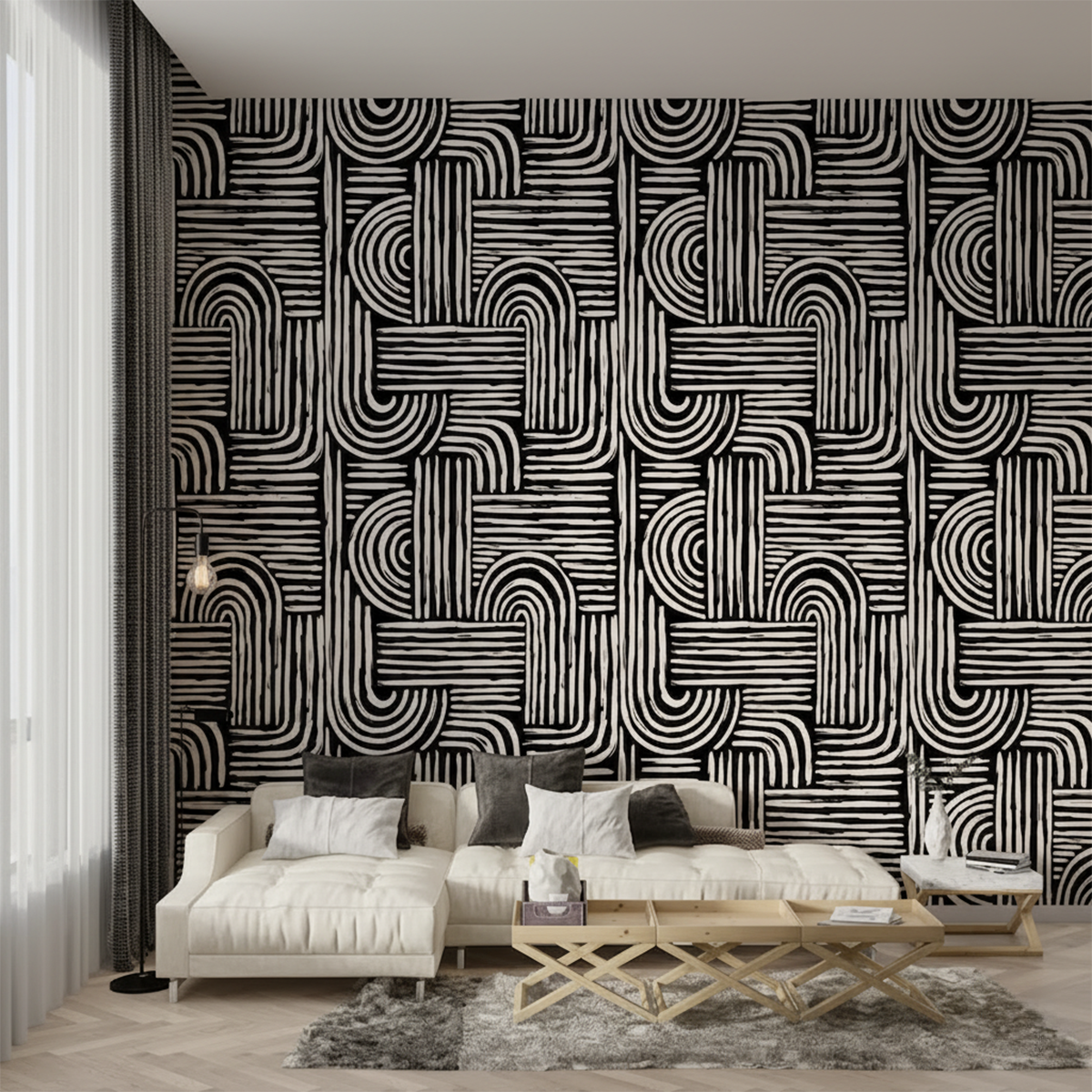 Energize your space with this striking arch-and-line wallpaper that blends raw brush textures with bold geometric forms. Its hand-drawn stripes, sweeping arches, and carved block–inspired details create a powerful visual rhythm that instantly turns any wall into modern art. The sharp contrast of black against soft cream brings depth and drama, making it a perfect centrepiece for minimalist living rooms, creative studios, or eclectic bedrooms craving a statement with Bare Boho soul.