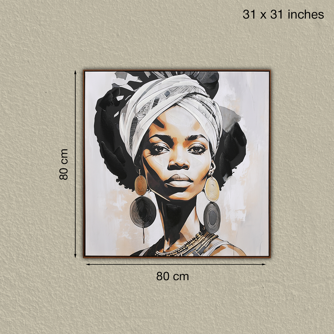 Command attention with Auric Grace, a Handmade Textured Wall Painting that celebrates bold femininity through expressive artistry and golden highlights. The striking portrait of a woman adorned with a voluminous white headdress and gleaming jewelry exudes power, poise, and elegance. Set within a warm bronze floater frame, this statement piece infuses contemporary spaces with confidence and cultural richness.