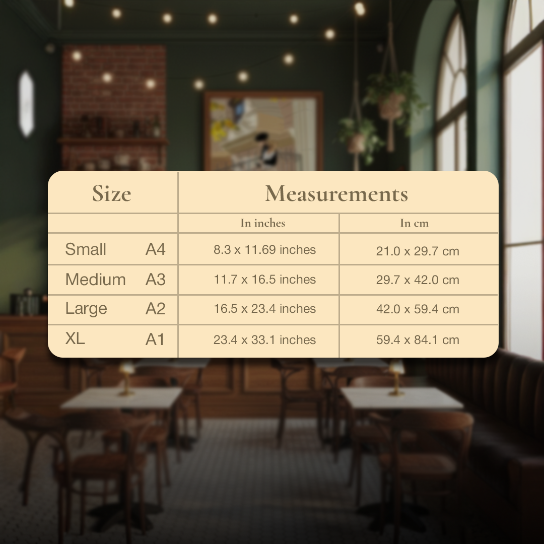| Size | Small A4 - 8.3 x 11.69 inch Medium A3 - 11.7 x 16.5 inch Large A2 - 16.5 x 23.4 inch Extra Large A1 - 23.4 x 33.1 inch |