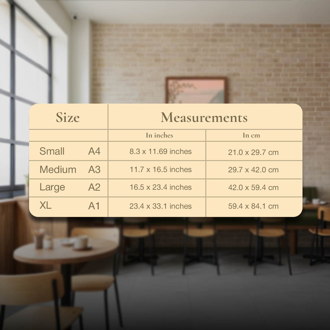| Size | Small A4 - 8.3 x 11.69 inch Medium A3 - 11.7 x 16.5 inch Large A2 - 16.5 x 23.4 inch Extra Large A1 - 23.4 x 33.1 inch |