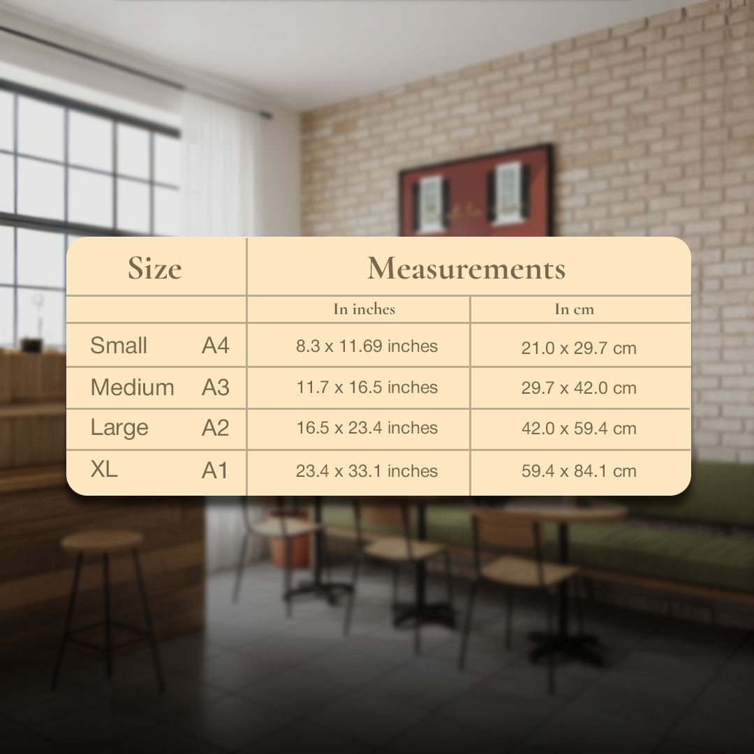 | Size | Small A4 - 8.3 x 11.69 inch Medium A3 - 11.7 x 16.5 inch Large A2 - 16.5 x 23.4 inch Extra Large A1 - 23.4 x 33.1 inch |