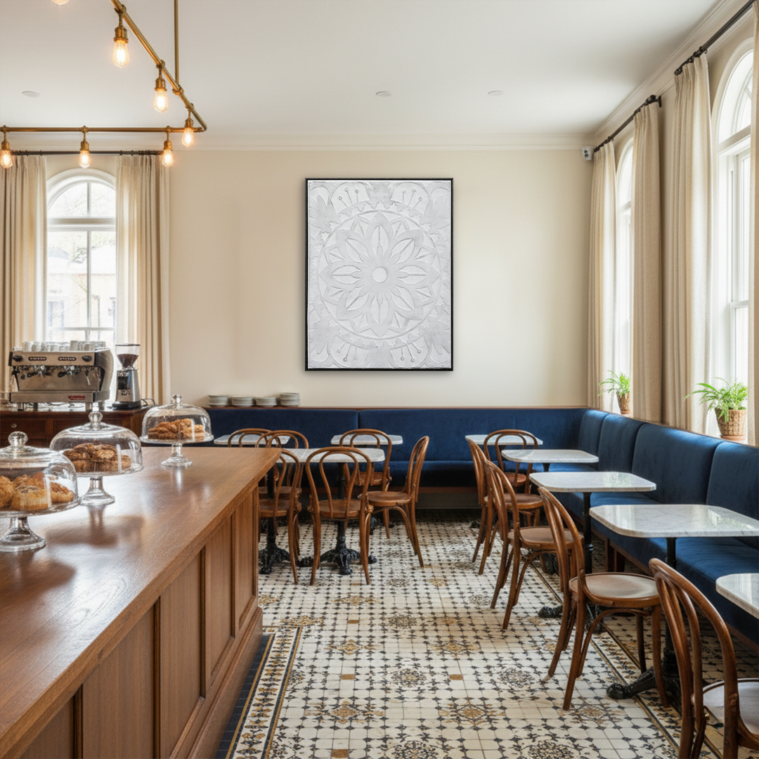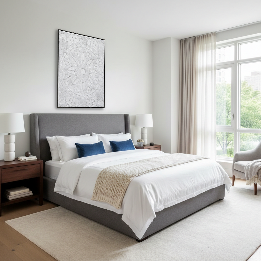 Elevate your interiors with the Celestial Harmony Textured Mandala Handmade Wall Painting, a sculptural work of serene sophistication. This 3D textured relief art features an intricate mandala pattern in pure white, where light and shadow bring every raised detail to life. Encased in a sleek wooden frame, it creates a striking contrast while maintaining a minimalist, calming presence. Ideal for adding tactile elegance to modern, bohemian, or transitional spaces.
