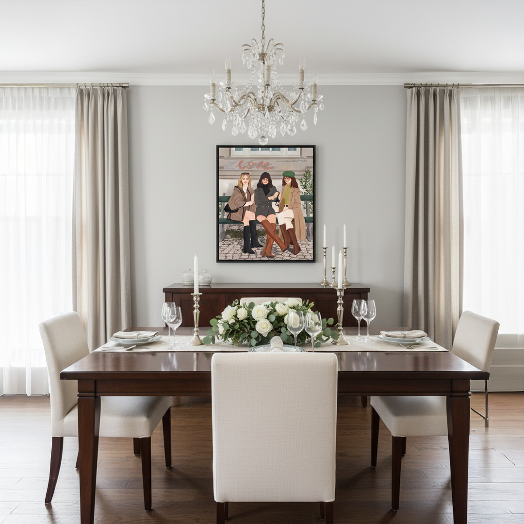 Infuse your space with the charm of modern friendship and effortless style through the “City Friends” Digital Wall Painting. This elegant artwork portrays three fashionable women enjoying a chic city moment- dressed in timeless coats, boots, and hats, surrounded by classic urban details. With its earthy palette and sophisticated aesthetic, it brings warmth, fashion, and a touch of cosmopolitan flair to your living room or social nook.