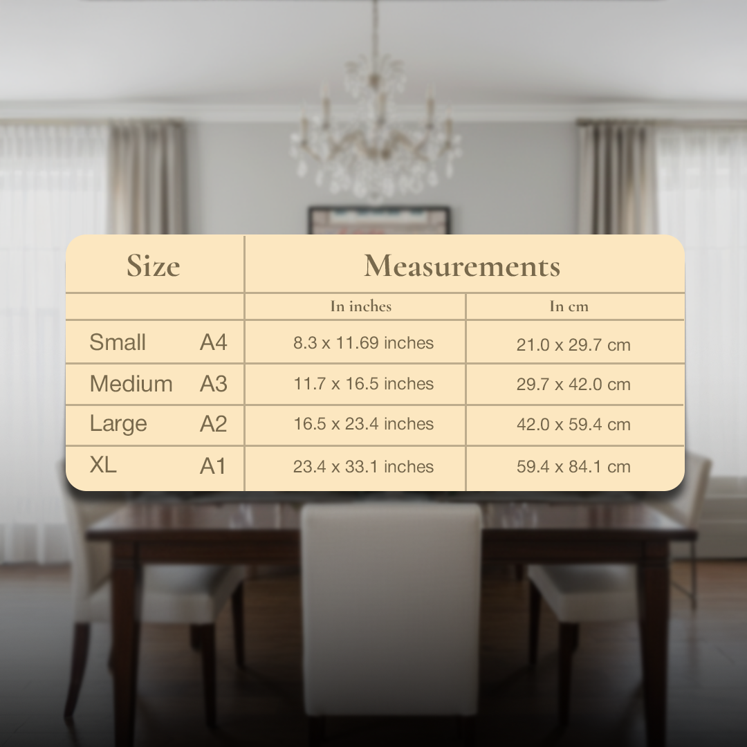 | Size | Small A4 - 8.3 x 11.69 inch Medium A3 - 11.7 x 16.5 inch Large A2 - 16.5 x 23.4 inch Extra Large A1 - 23.4 x 33.1 inch |