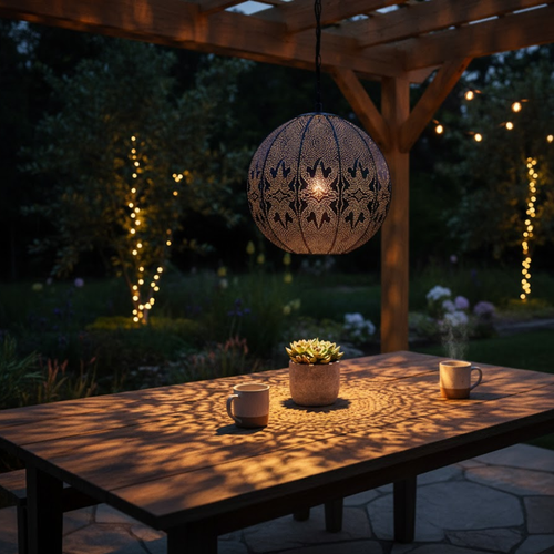 Intricate Artisan Detailing: Thousands of tiny, hand-perforated holes form a mesmerizing “desert bloom” motif, casting soft starburst patterns across your walls and ceiling when lit.