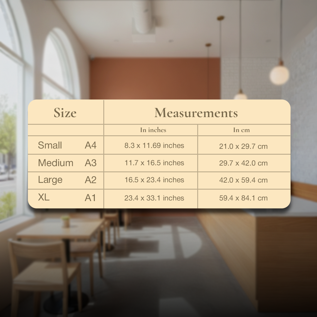 | Size | Small A4 - 8.3 x 11.69 inch Medium A3 - 11.7 x 16.5 inch Large A2 - 16.5 x 23.4 inch Extra Large A1 - 23.4 x 33.1 inch |