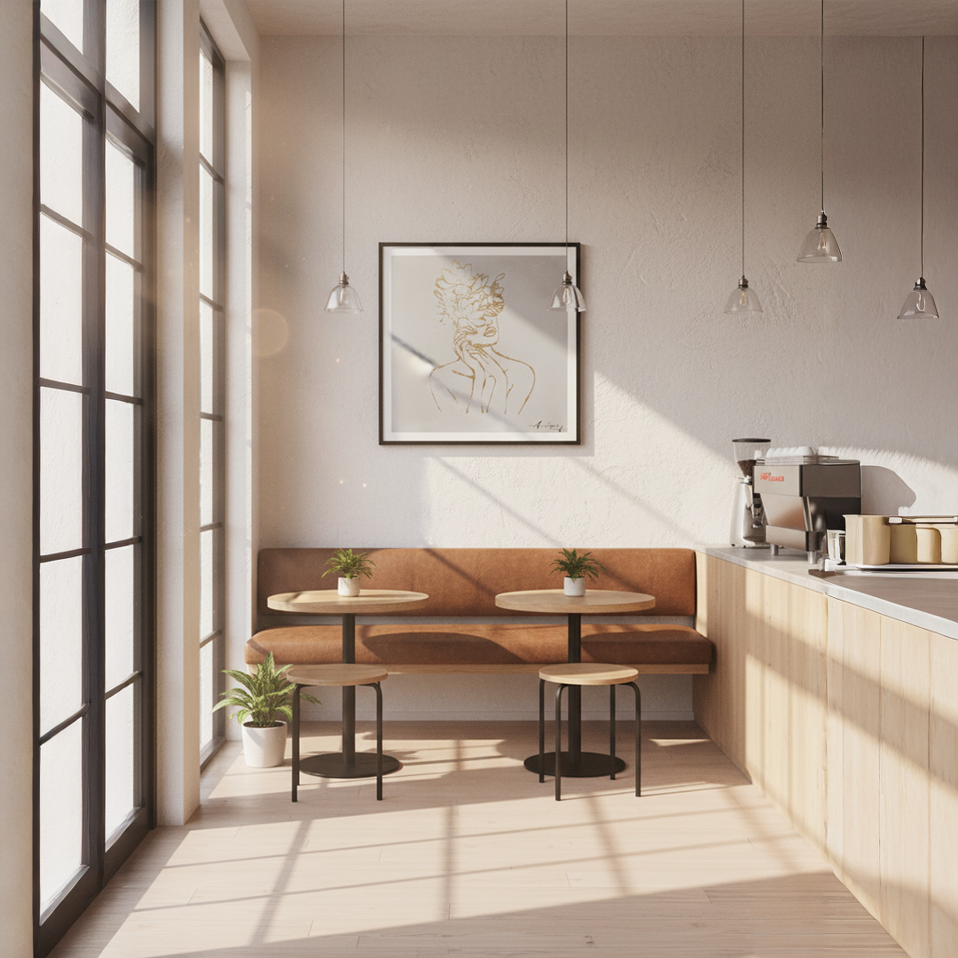 • Neutral Background: Soft grey or taupe backdrop highlights the gold line work without overpowering the space.