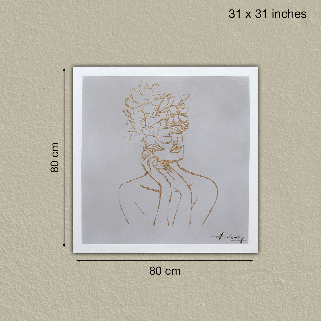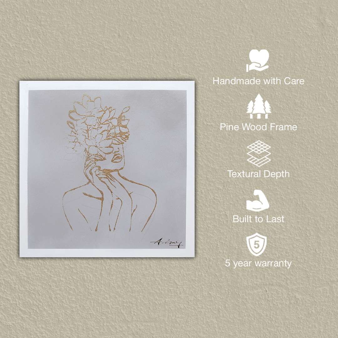 Bring calm elegance to your interiors with the Golden Serenity Handmade Textured Wall Painting. Featuring a delicate, single-line portrait of a woman accented with subtle floral motifs, this artwork is rendered in shimmering gold foil on a soft neutral background. The slim matte black frame adds a modern, refined border, making it a sophisticated focal point for living rooms, bedrooms, or home offices.