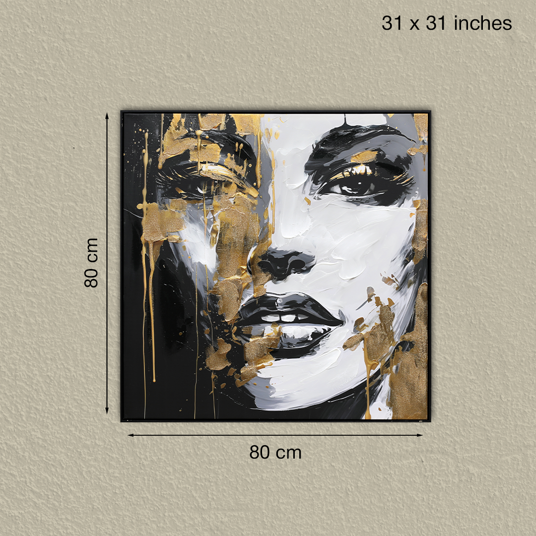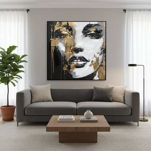 Transform your space with the Midnight Radiance Handmade Textured Wall Painting, a dramatic abstract portrait rendered in bold black, crisp white, and shimmering metallic gold. The textured, hand-applied brushstrokes create a rich, three-dimensional effect, while the wooden frame provides a contemporary finishing touch. Perfect for modern, transitional, or minimalist interiors, this piece serves as a striking focal point above a sofa, console, or in a professional setting.