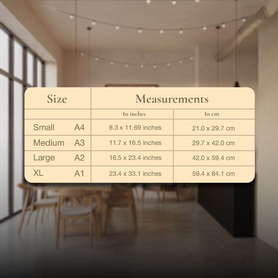 | Size | Small A4 - 8.3 x 11.69 inch Medium A3 - 11.7 x 16.5 inch Large A2 - 16.5 x 23.4 inch Extra Large A1 - 23.4 x 33.1 inch |