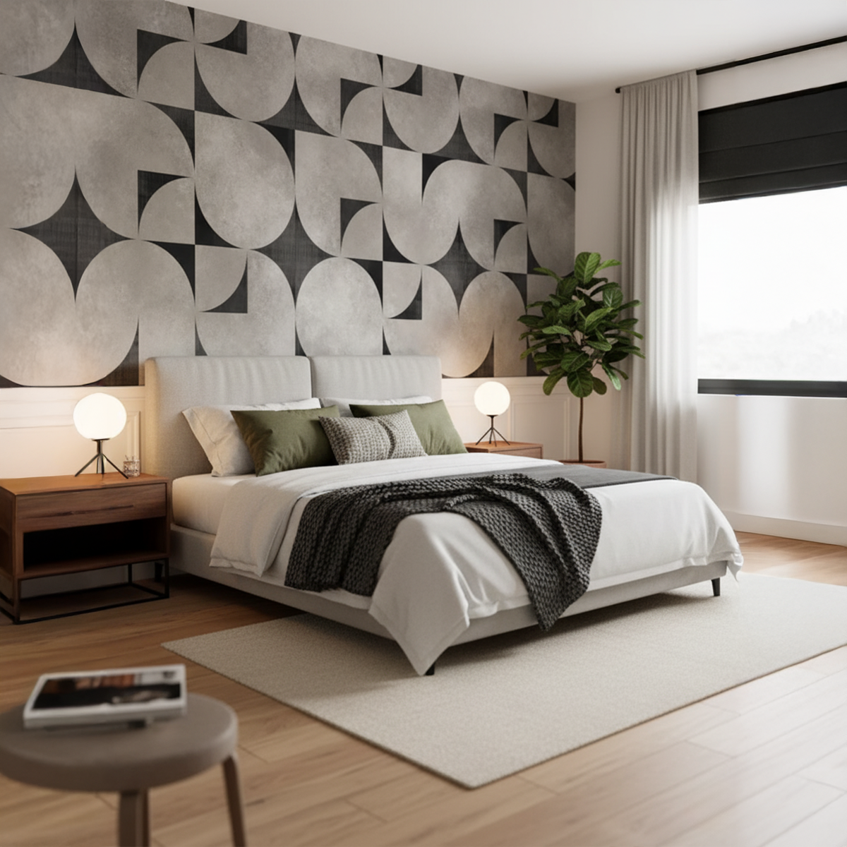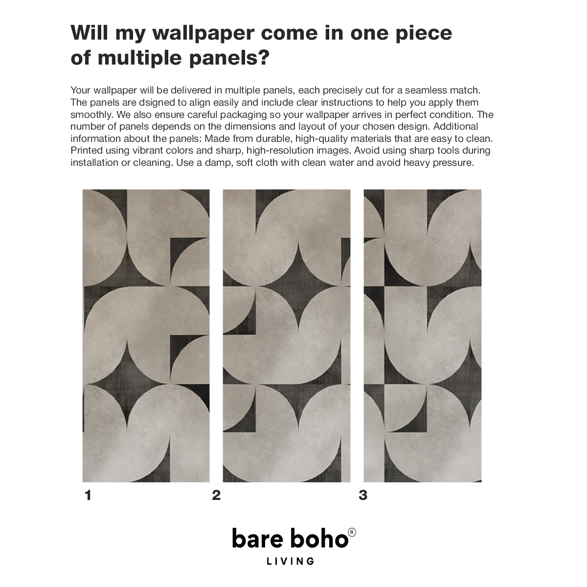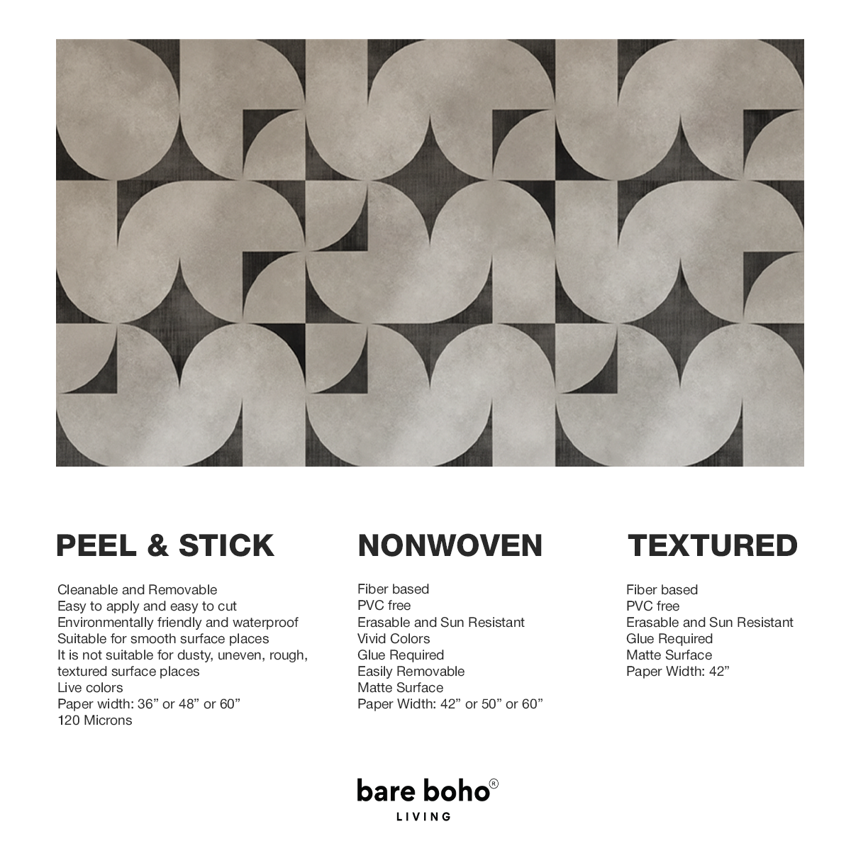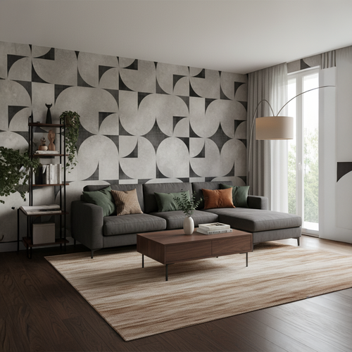 Bring timeless Mid-Century elegance into your home with this sweeping circular geometric design that blends retro charm with modern sophistication. Its interlocking arcs, textured greys, and charcoal accents create a bold architectural presence that instantly elevates large living spaces. Crafted to transform any feature wall into a statement of effortless, retro-chic style with Bare Boho soul.