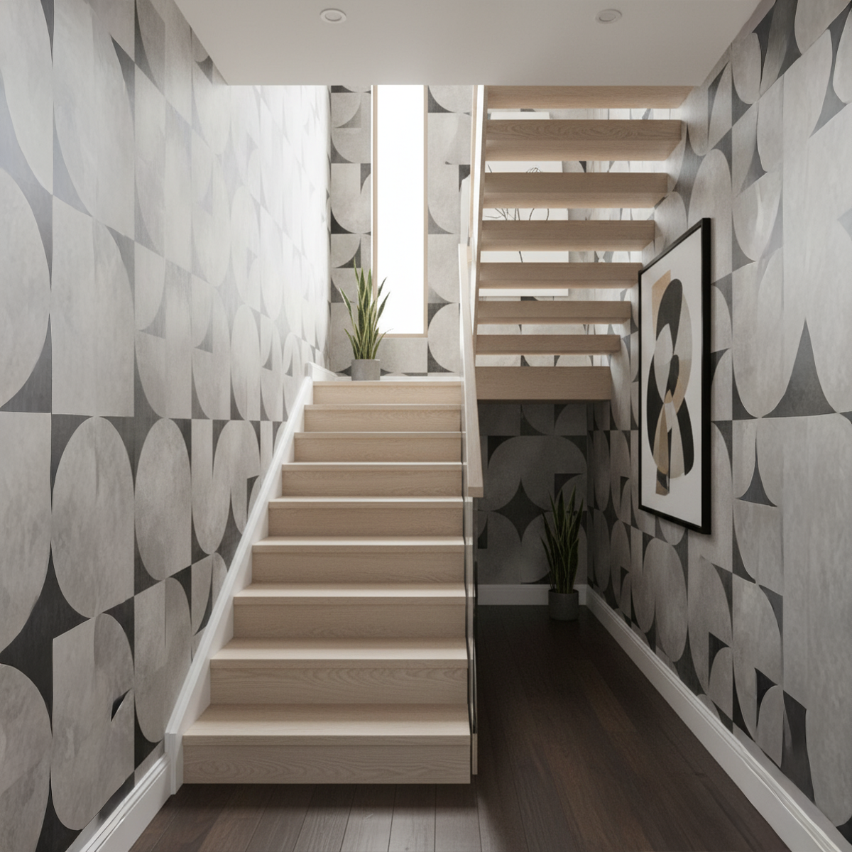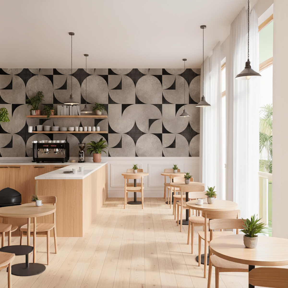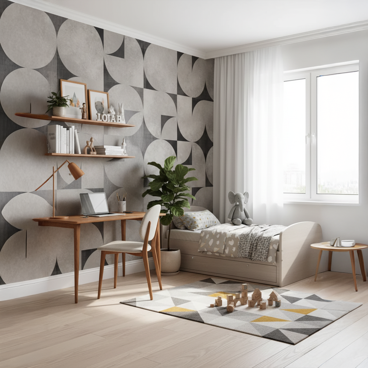 Bring timeless Mid-Century elegance into your home with this sweeping circular geometric design that blends retro charm with modern sophistication. Its interlocking arcs, textured greys, and charcoal accents create a bold architectural presence that instantly elevates large living spaces. Crafted to transform any feature wall into a statement of effortless, retro-chic style with Bare Boho soul.