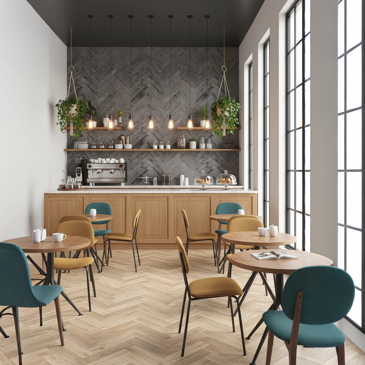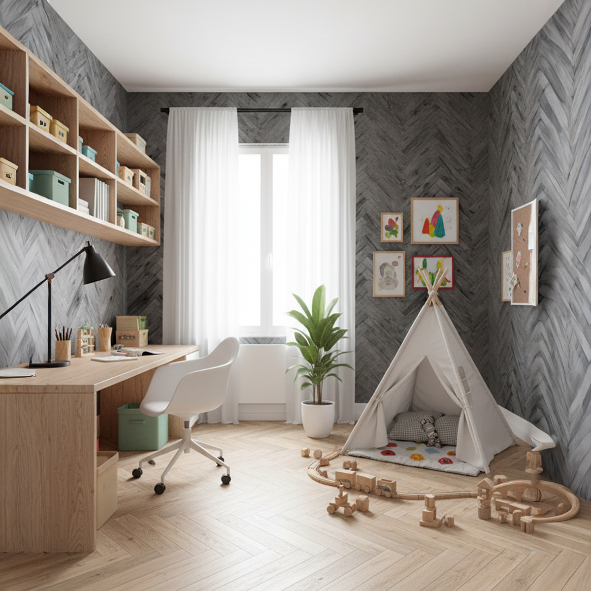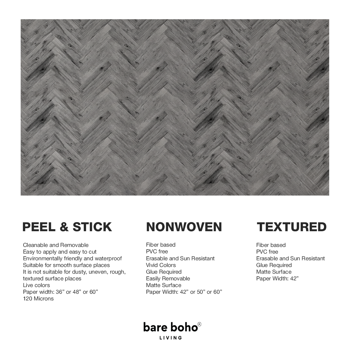 Anchor your space with the bold, rustic charm of this charcoal-toned chevron design that layers the warmth of reclaimed wood with a sleek, modern edge. Its weathered texture, distressed highlights, and striking V-shaped pattern create an instant focal point, adding depth and movement to media walls, bedrooms, and contemporary living areas. The rich charcoal and slate palette pairs effortlessly with concrete, metal, and minimalist furnishings, bringing grounded Bare Boho character to any room.