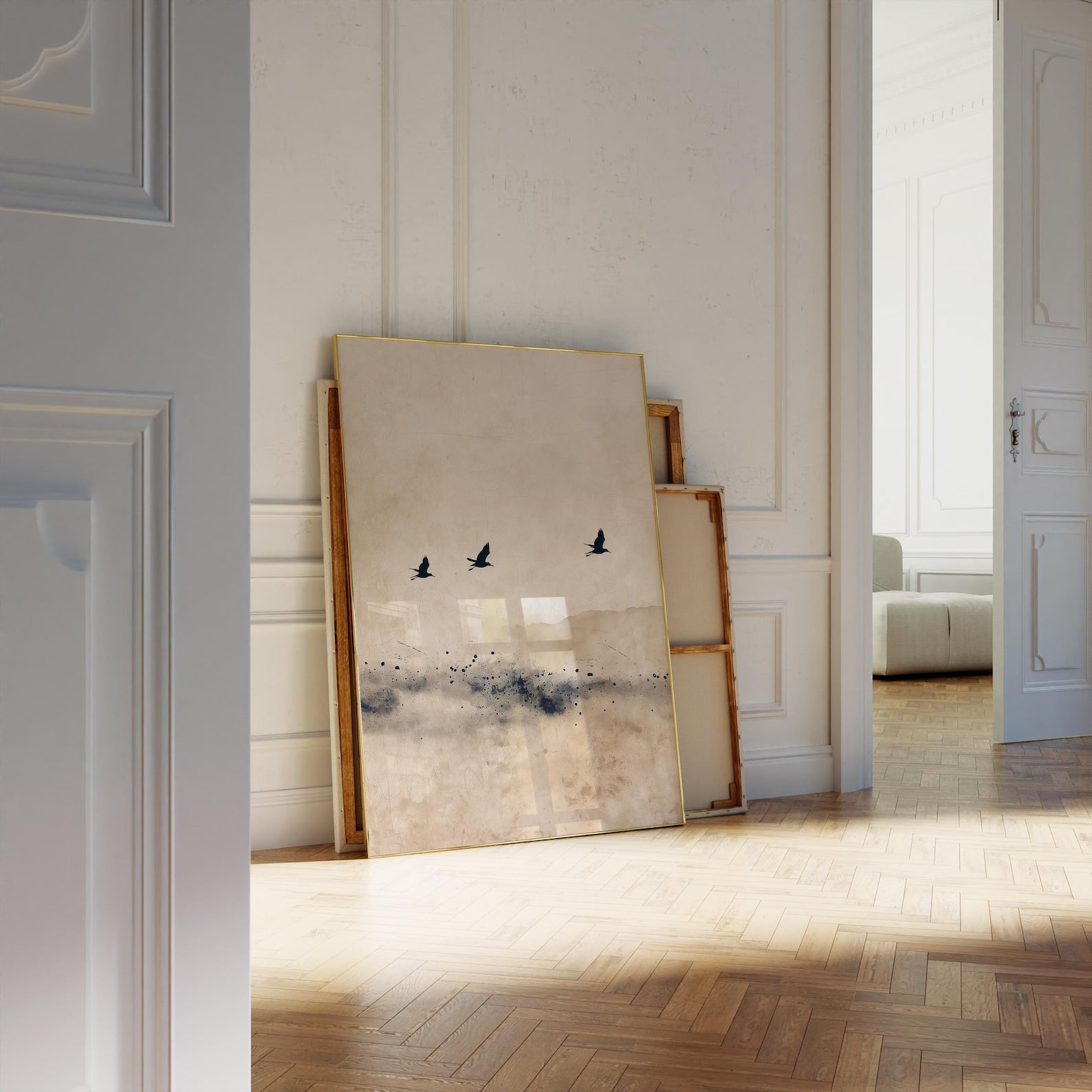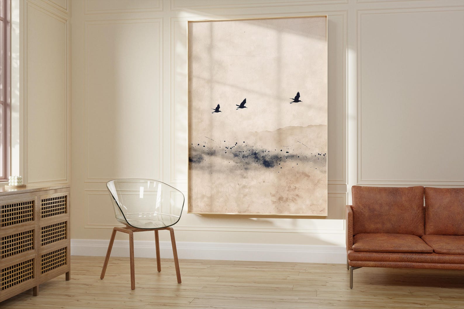 The Soaring Serenity Digital Wall Painting embodies minimalism through its poetic depiction of birds in flight against a soft neutral horizon. Clean lines and gentle tones evoke balance, tranquility, and timeless beauty, making it a perfect accent for Scandinavian, Japanese, or modern interiors. This refined piece brings a touch of calm and visual poetry to your walls.