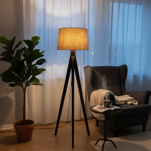 Soft Ambient Lighting: White linen shade for warm, inviting illumination.