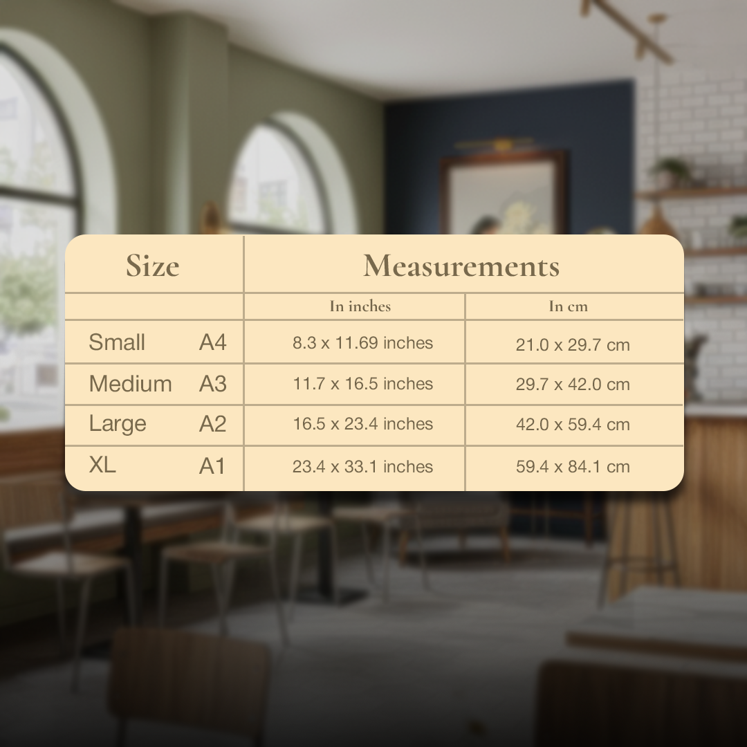 | Size | Small A4 - 8.3 x 11.69 inch Medium A3 - 11.7 x 16.5 inch Large A2 - 16.5 x 23.4 inch Extra Large A1 - 23.4 x 33.1 inch |