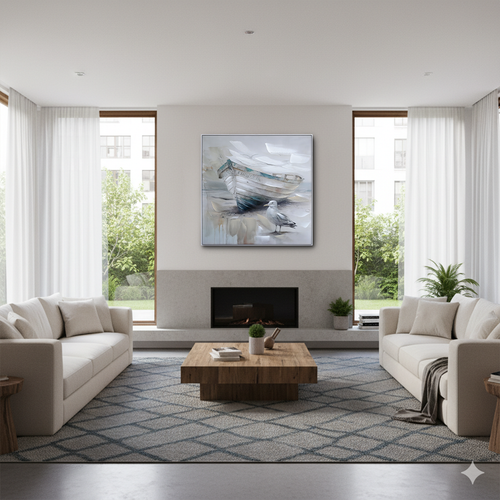 Immerse your space in seaside serenity with the Tranquil Shore Handmade Textured Wall Painting. Depicting a softly abstracted scene of a resting boat and a lone seagull, this artwork captures the calm essence of the coast through soothing tones and layered textures. It brings a sense of quiet sophistication to any room.