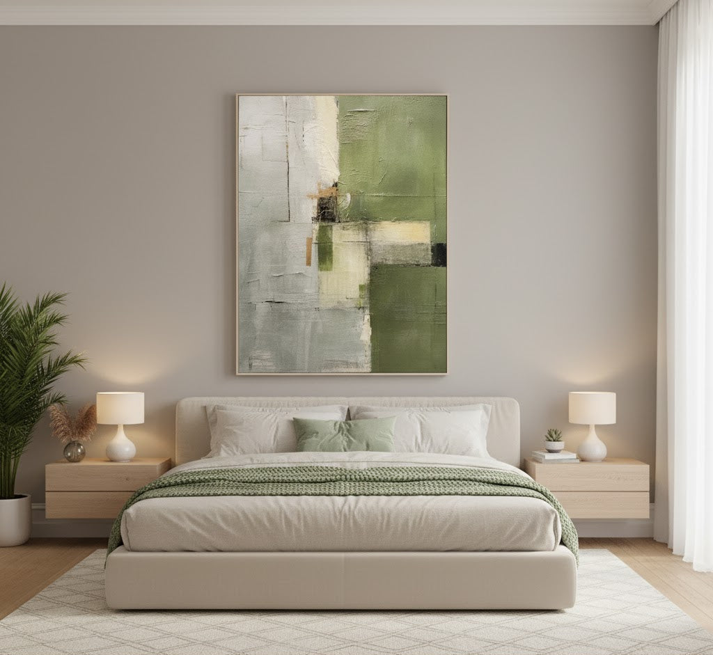 Infuse your space with the serene balance of Verdant Handmade Painting- a contemporary abstract canvas defined by its rich texture and harmonious natural tones. Layered with thick, tactile brushstrokes in sage green, cool grey, cream, and subtle ochre, this piece brings a grounded, organic elegance to modern interiors. Each piece is crafted by local artists on fine-textured canvas, blending natural pigments for a timeless, handmade finish. Designed for collectors who appreciate soulful, contemporary artistry.