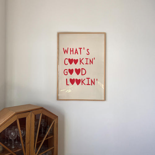 Add charm and playfulness to your space with our “What’s Cooking Good Looking” typography wall art print. A quirky yet stylish design, it brings warmth and personality to kitchens, dining areas, or cozy corners. Perfect as a conversation starter, this frame- instantly transforms your walls with a touch of humor and modern flair.